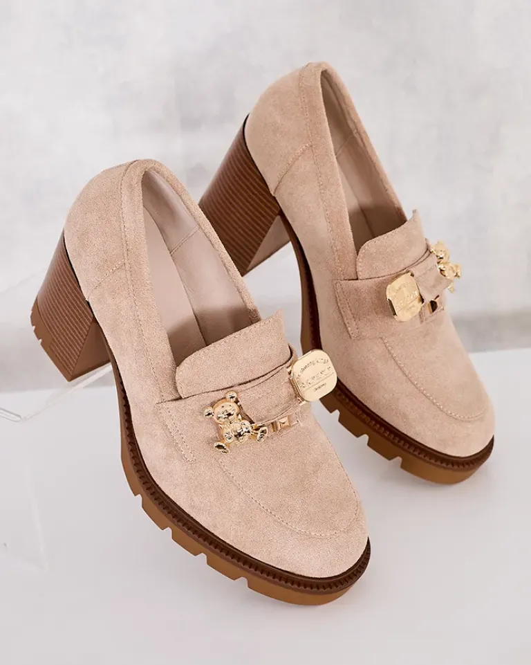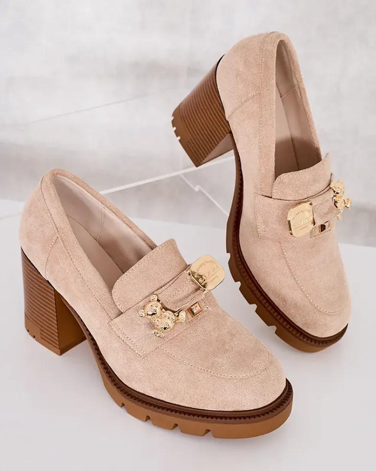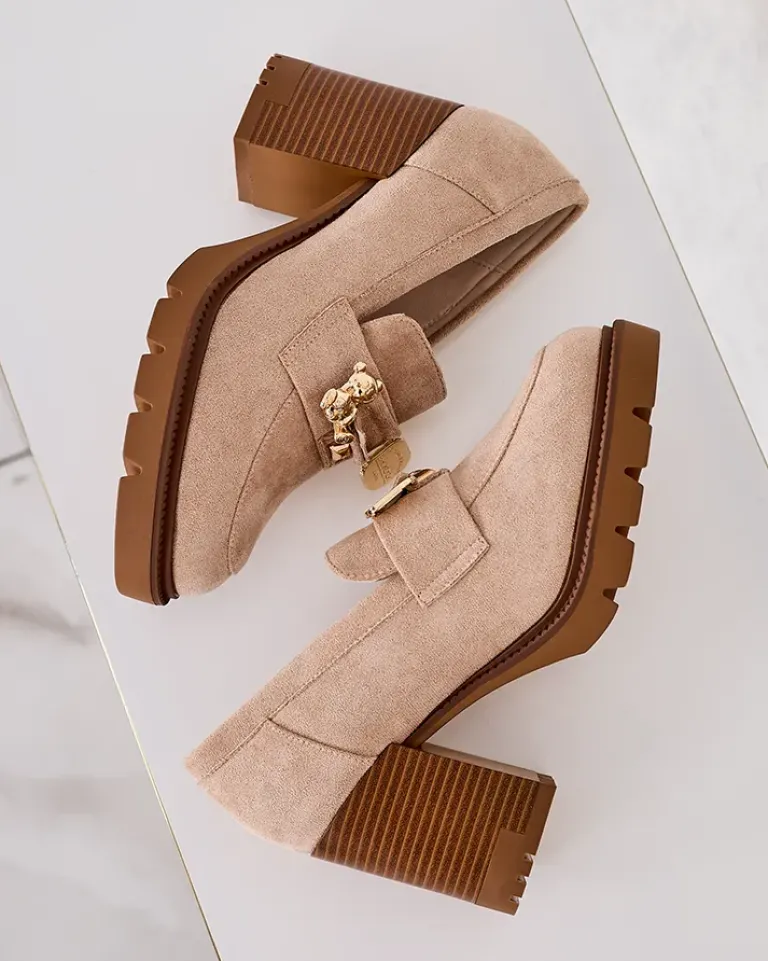 - Przepiękne damskie mokasyny na wysokim słupku. Model w stylu casual jest wykonany z zamszowej skóry ekologicznej i eko skórzanej wkładki. Nosek zaokrąglony zdobiony subtelną ozdobą. Idealna baza dla wielu codziennych looków!