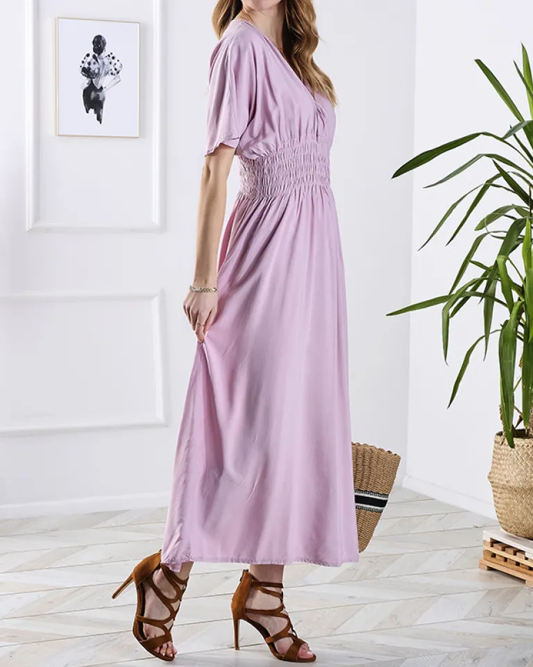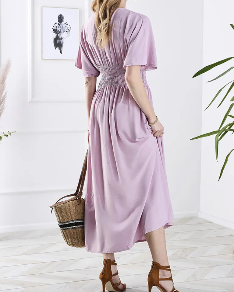 - Damska długa sukienka wykonana z lekkiej tkaniny bawełnianej. Model z krótkimi rękawami, posiada kopertowy dekolt oraz szeroką gumę w pasie. Idealna baza dla wielu letnich outfitów! UWAGA: Dokładność pomiaru (+/-) 1 cm.