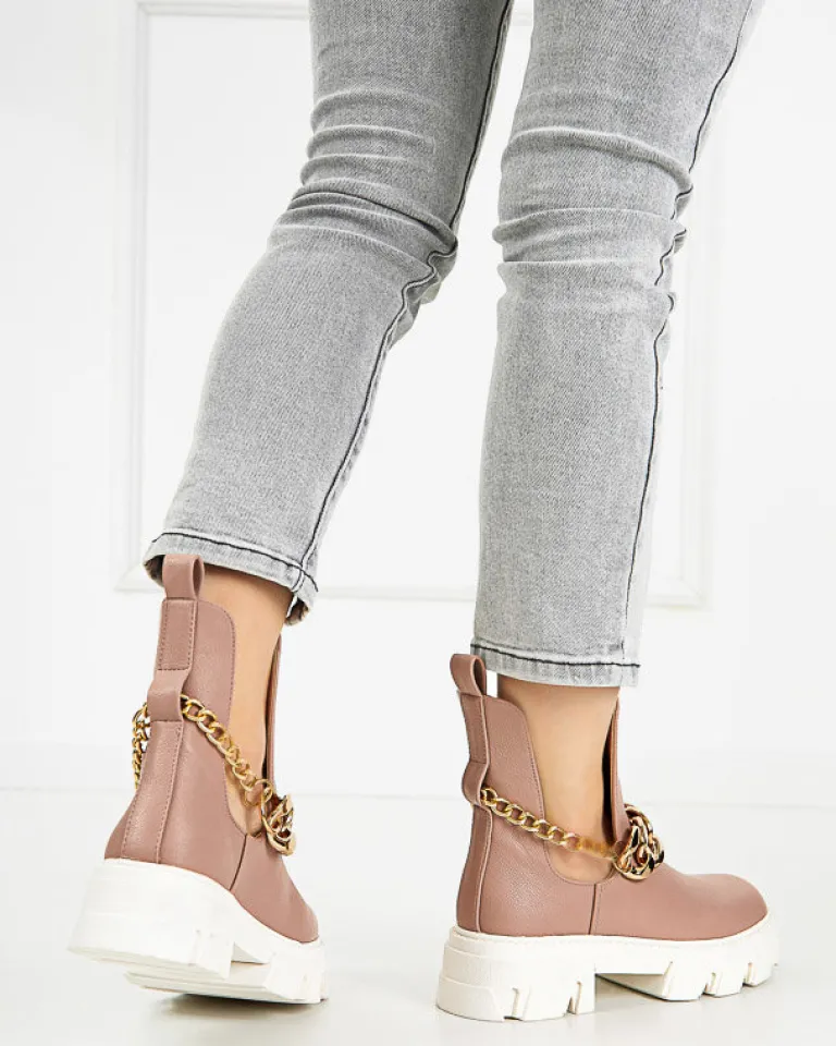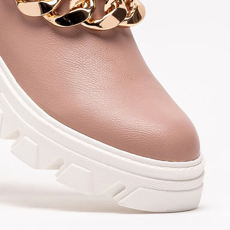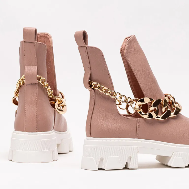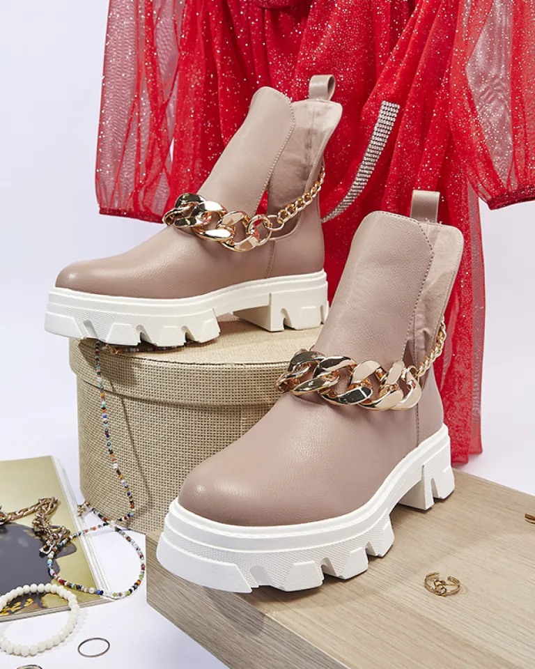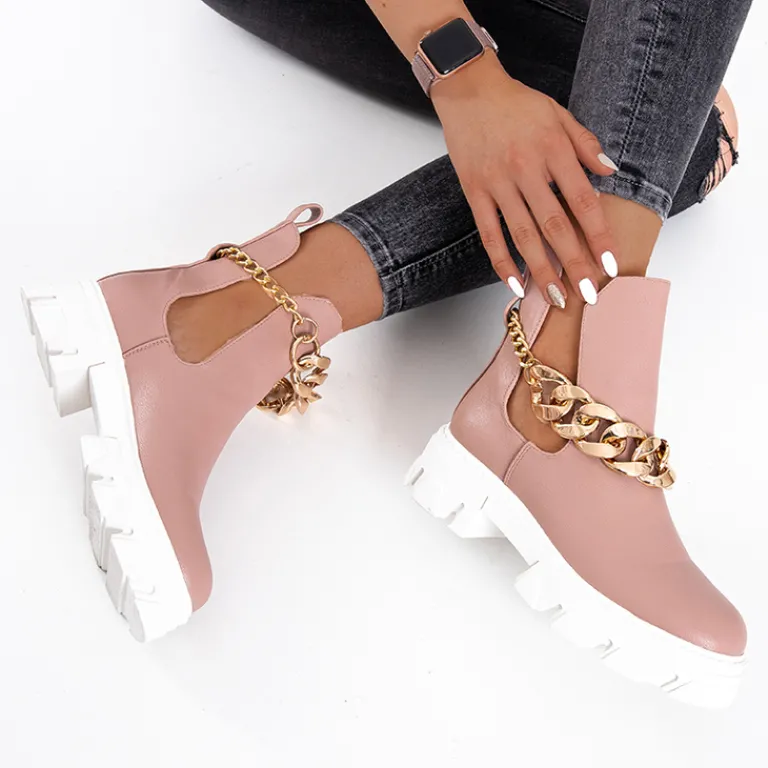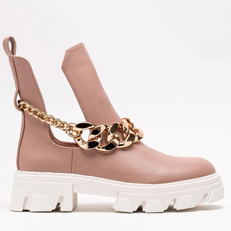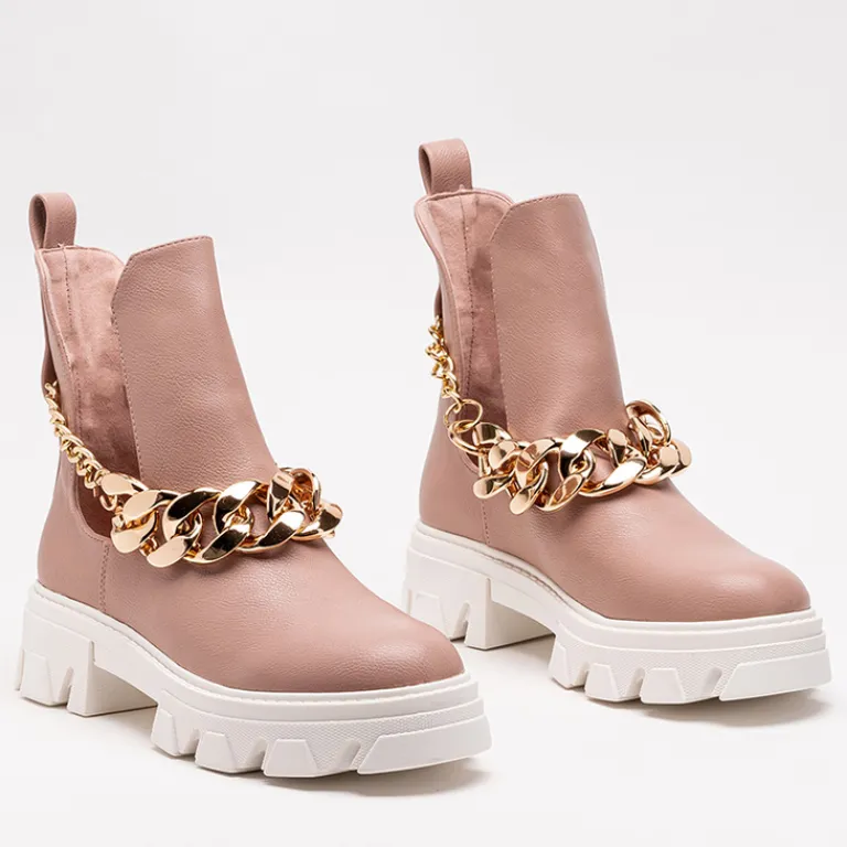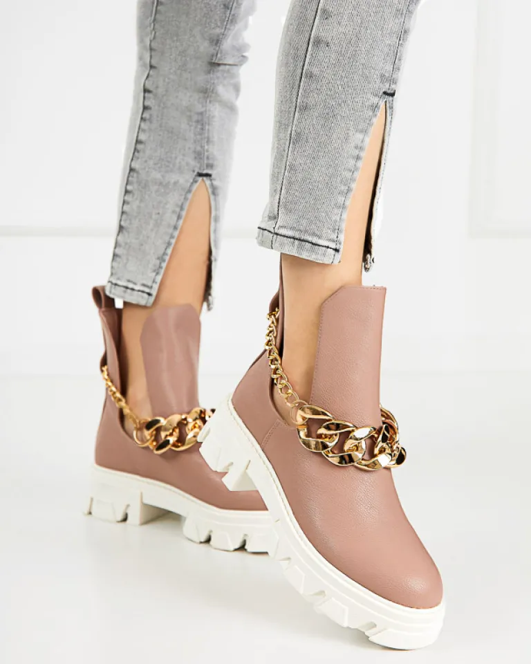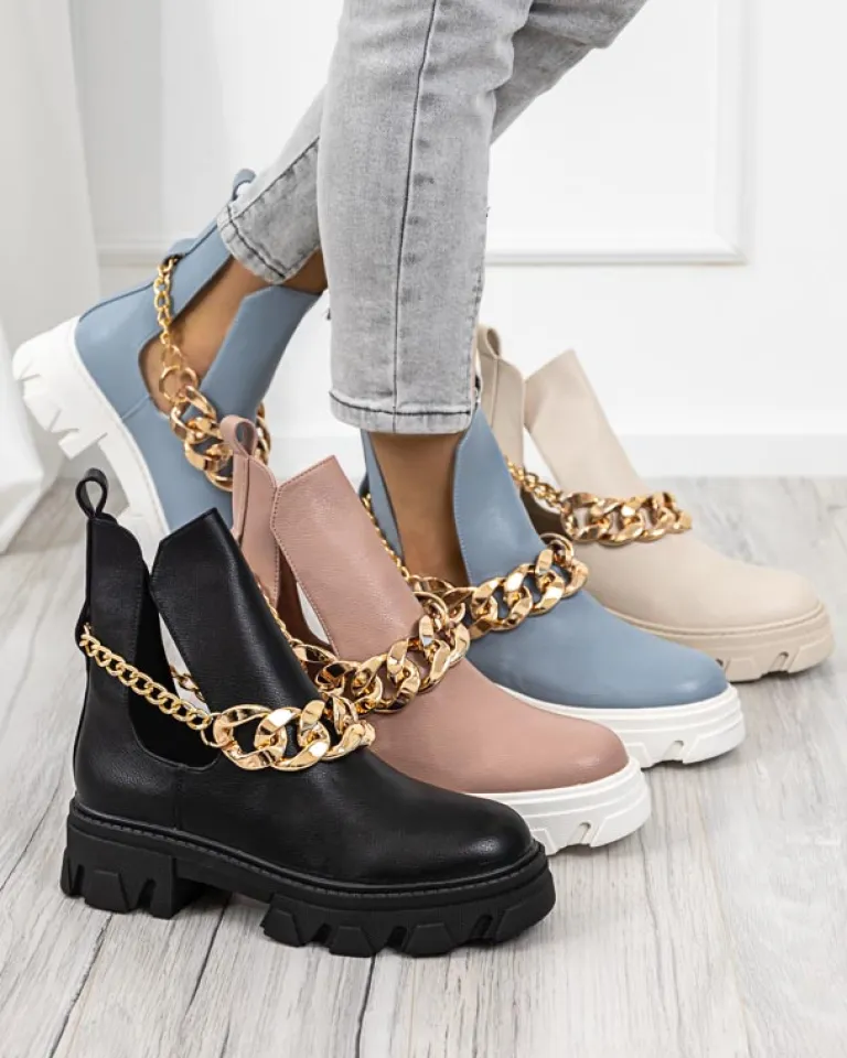 - Stylowe damskie botki z metalowym łańcuszkiem, na masywnej podeszwie. Cholewka z wycięciami wykonana ze skóry ekologicznej, wkładka to również skóra ekologiczna. Nadają się do wielu oryginalnych stylizacji.