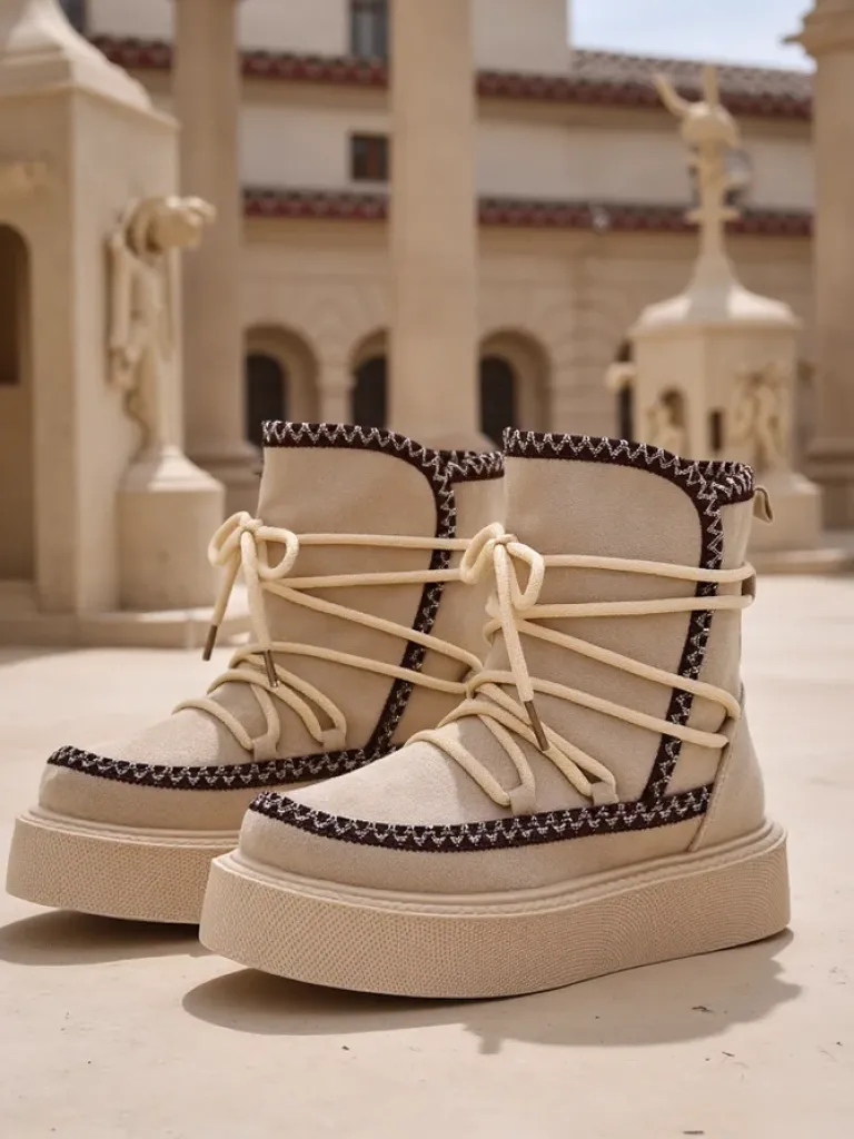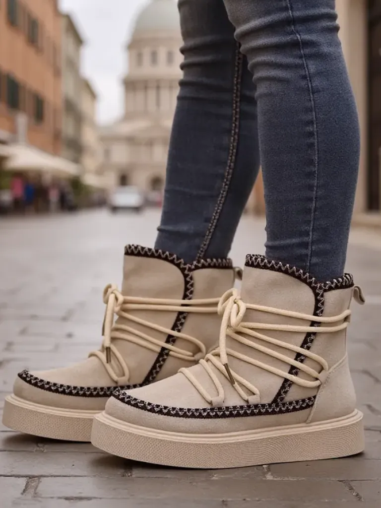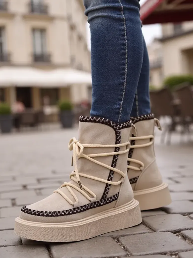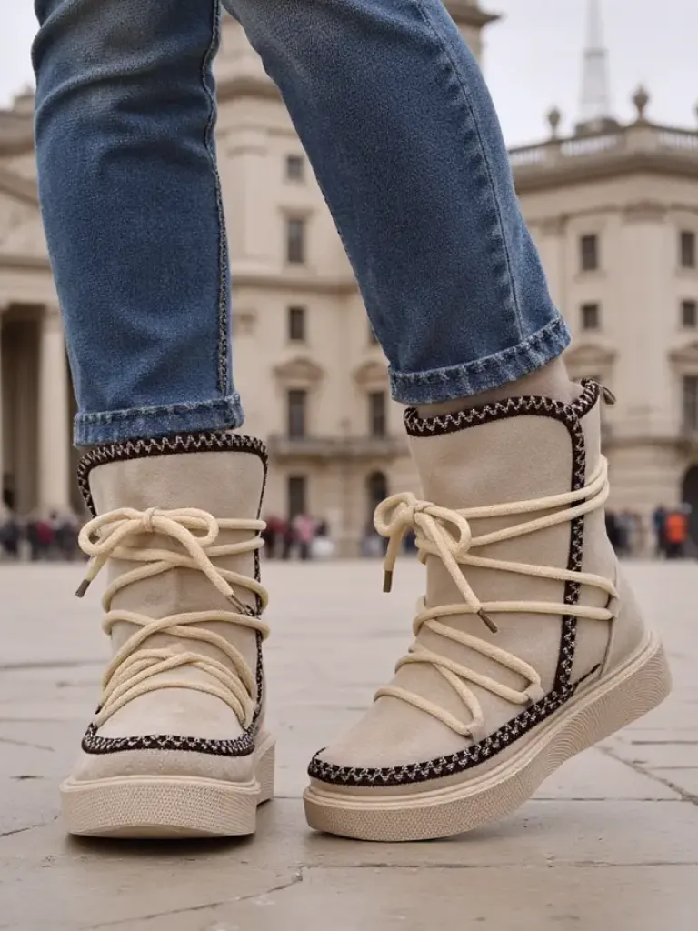 - Damskie obuwie typu śniegowce z cholewką wykonaną z zamszowej eko skóry. W środku delikatne ocieplenie, obuwie sznurowane. Idealne na zimę!