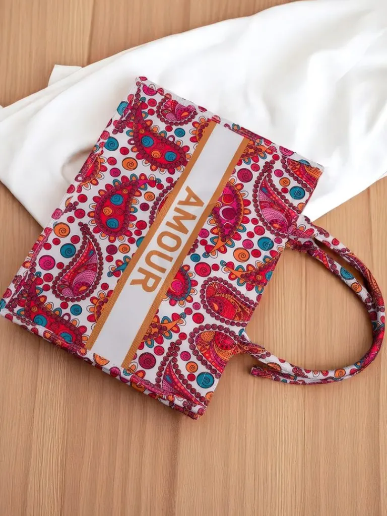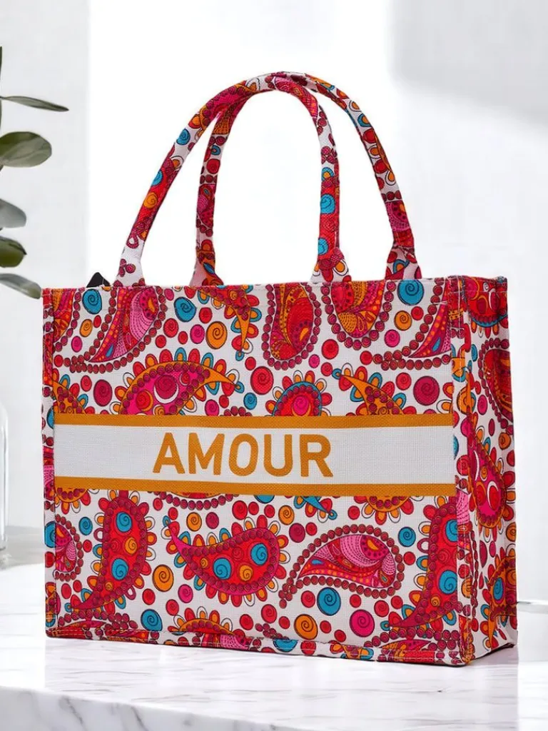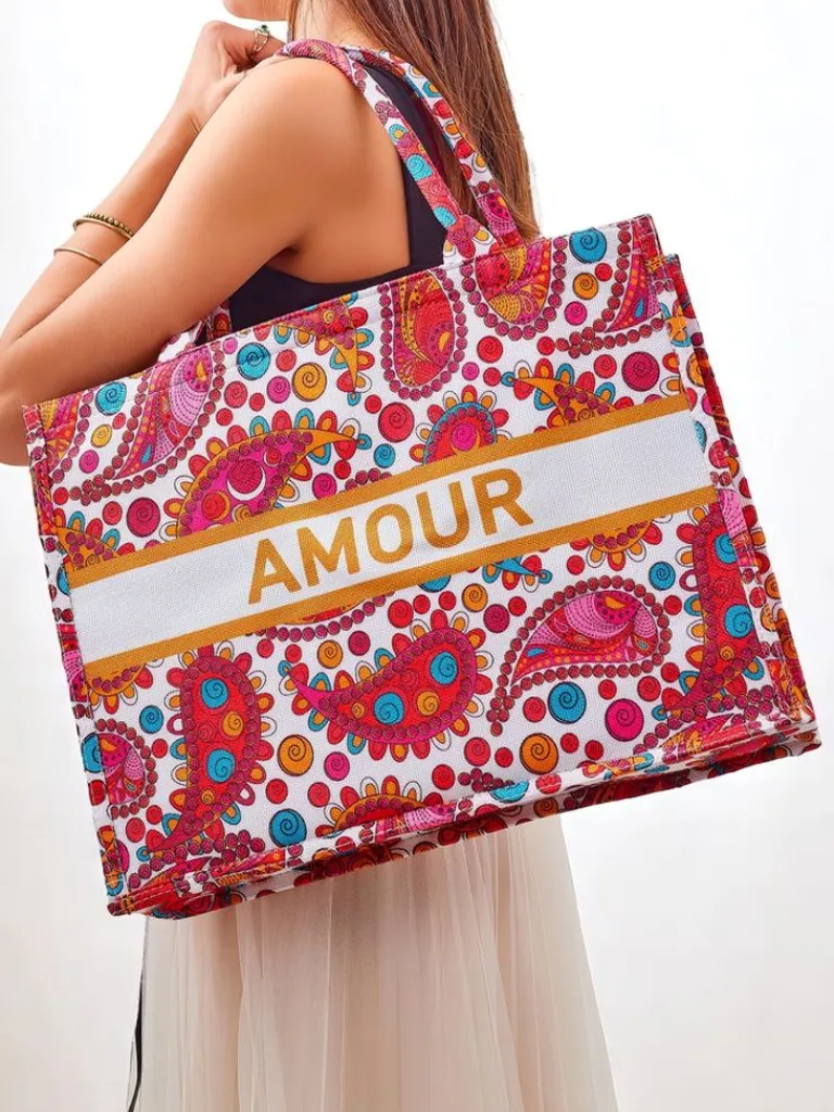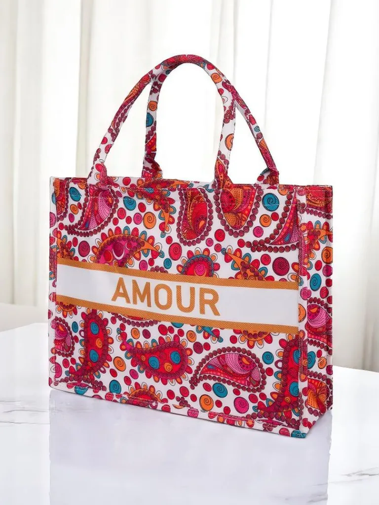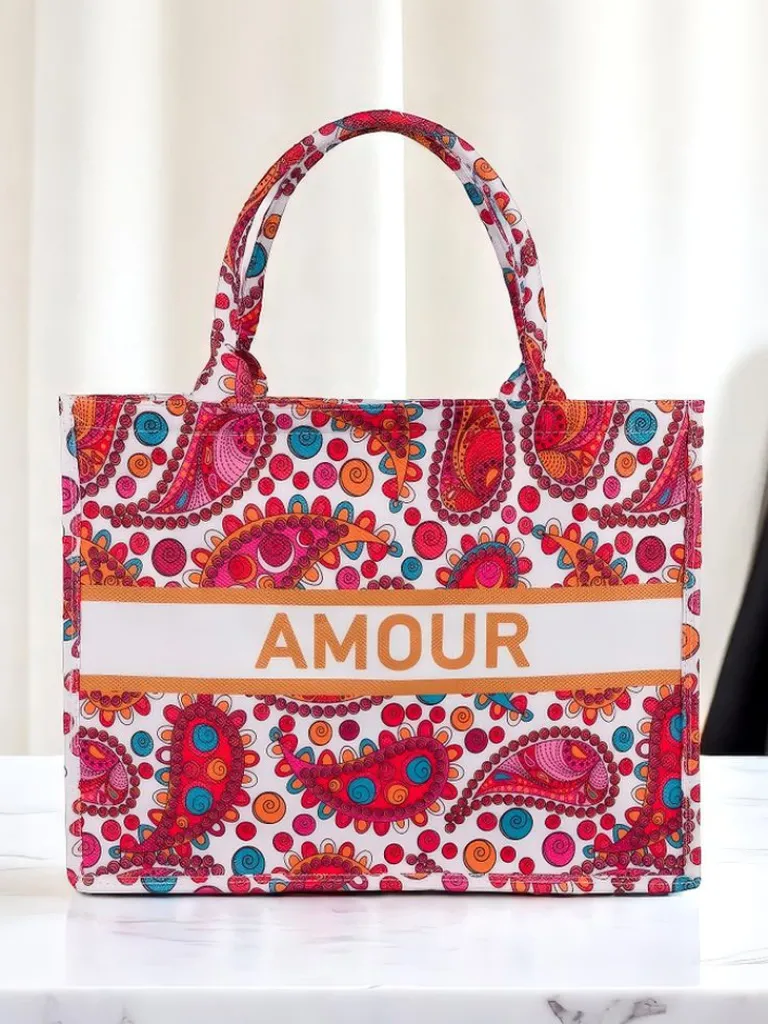 - Duża, materiałowa torebka damska z wzorzystym motywem i napisem AMOUR. 1 komora, zamek. Lekka, pojemna i stylowa – idealna na co dzień i letnie wyjścia!