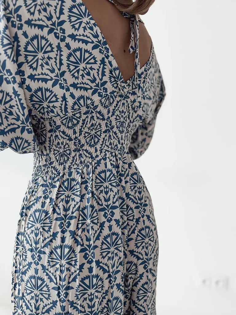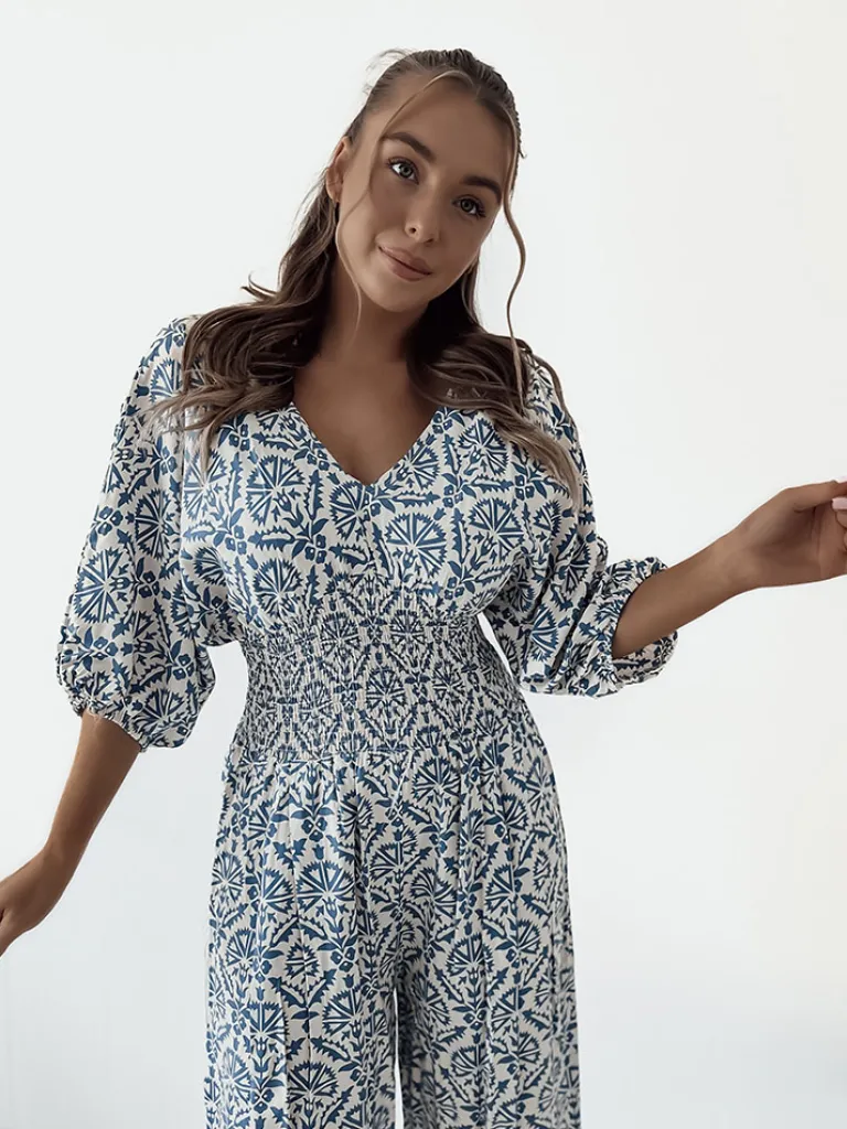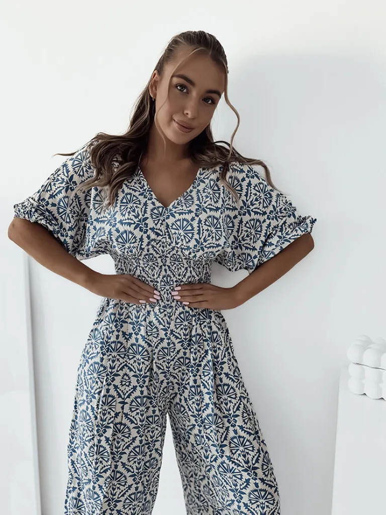 - Wzorzysty kombinezon damski z krótkimi rękawami. Model z dekoltem V oraz gumą w talii. Produkt posiada szerokie, długie nogawki.