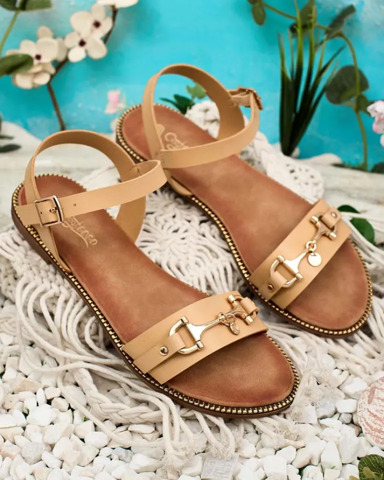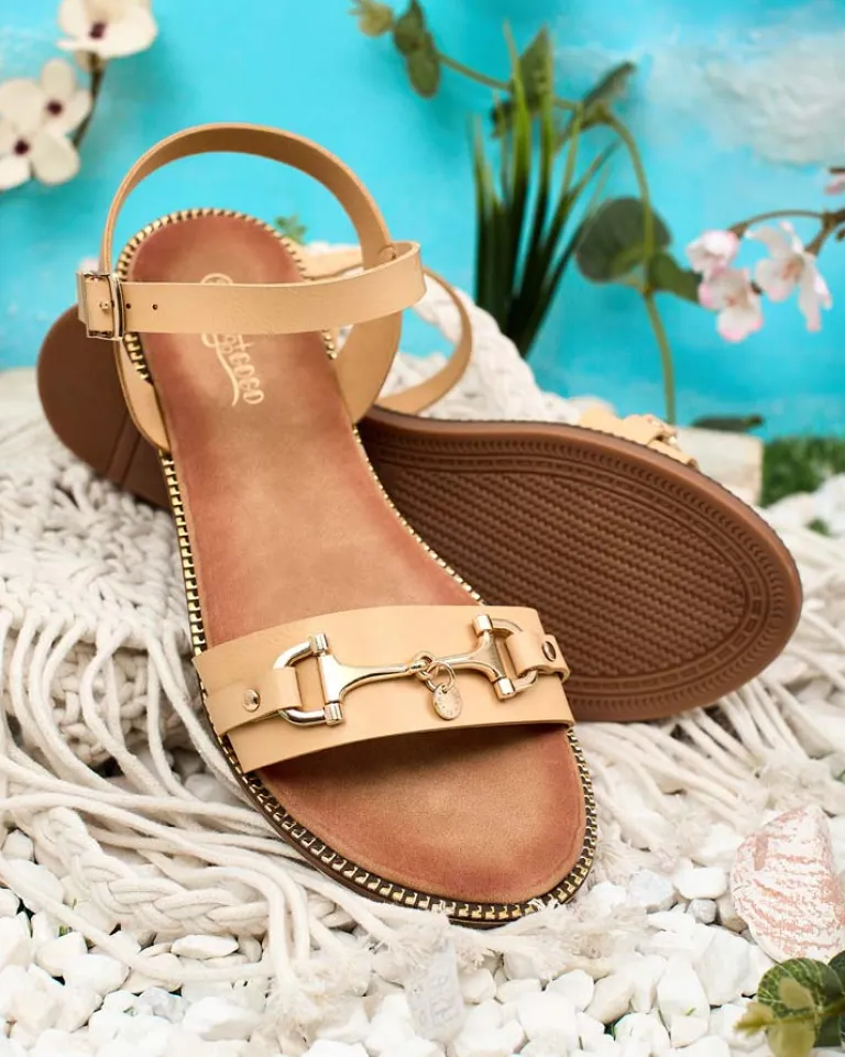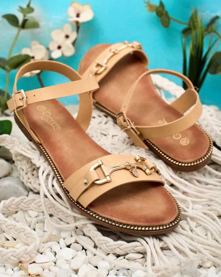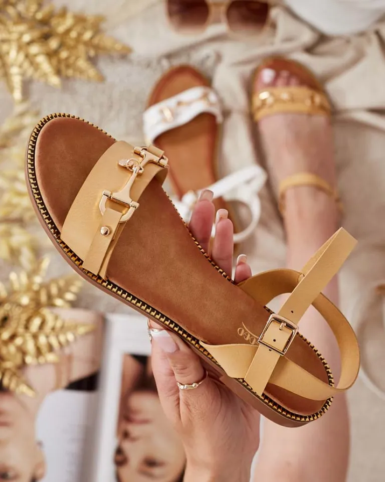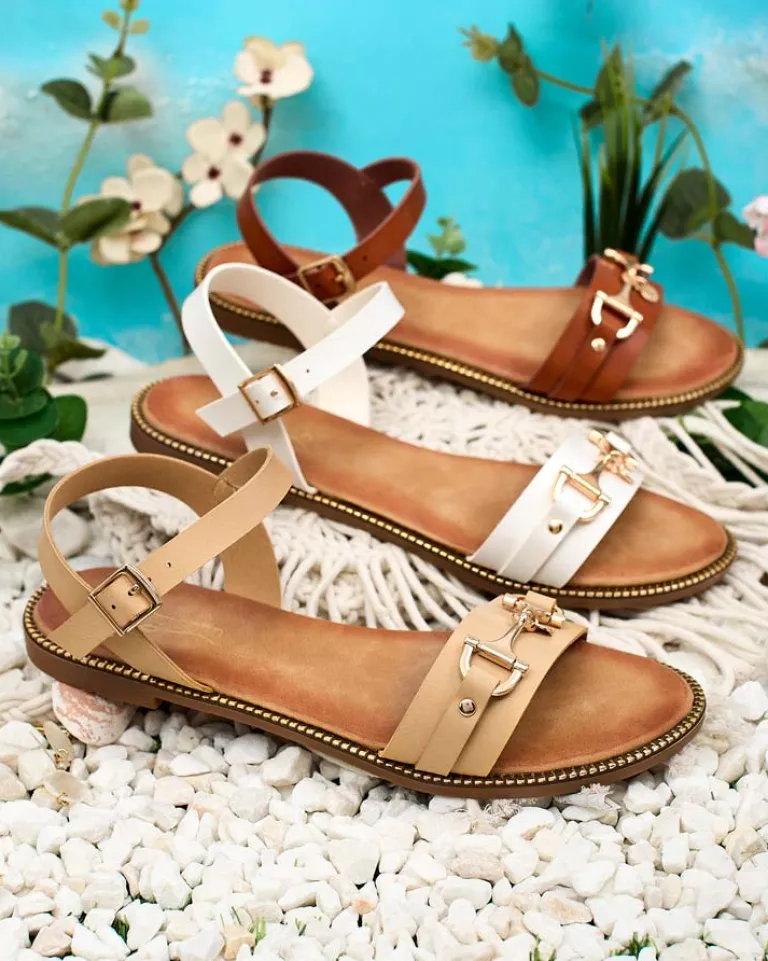 - Damskie sandałki na płaskiej podeszwie – to idealny pomysł na gorące letnie dni. Paseczki i wkładka wykonane ze skóry ekologicznej. Przód udekorowany metalową ozdobą, wokół kostki paseczek z zapięciem.