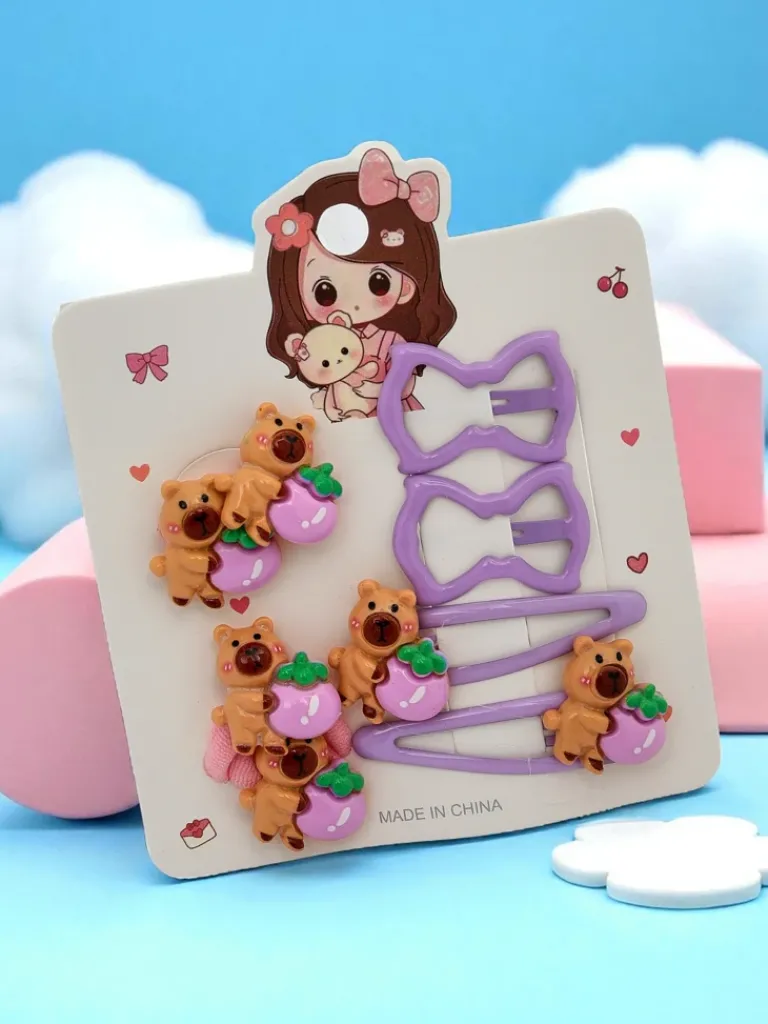 - Zestaw spinek do włosów z motywem niedźwiadków i kokardek – idealny dodatek dla dziewczynek.