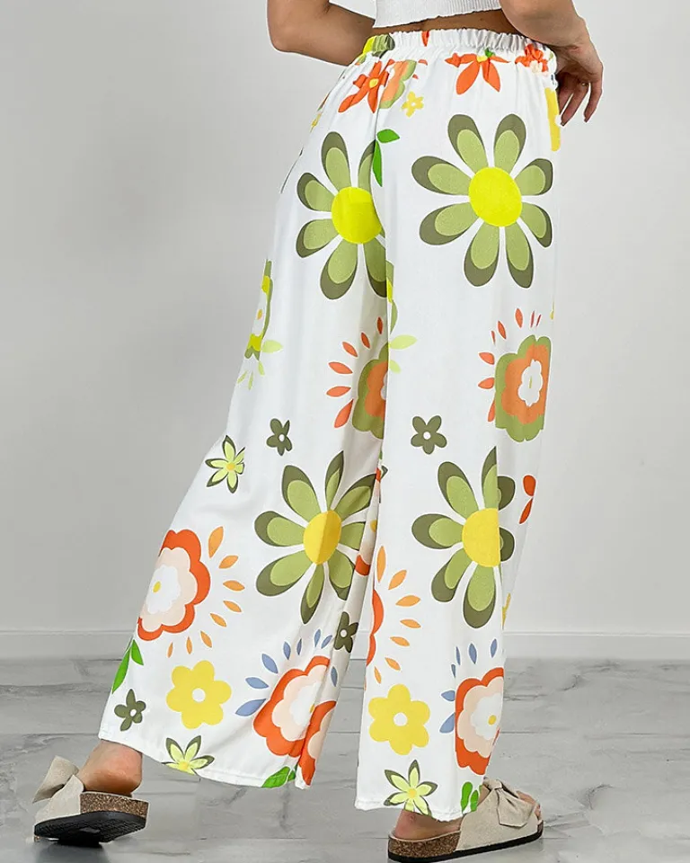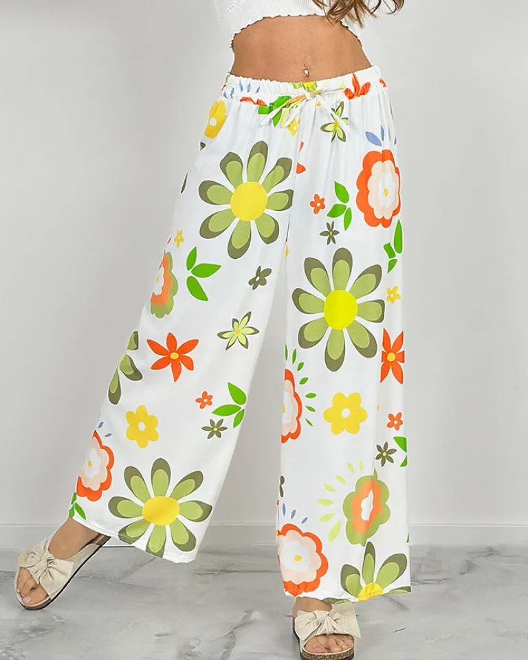 - Szerokie spodnie damskie we wzór w kwiaty. Model ze średnim stanem, z gumką i troczkami w pasie, posiada kieszenie z przodu. Moda i komfort w jednym!