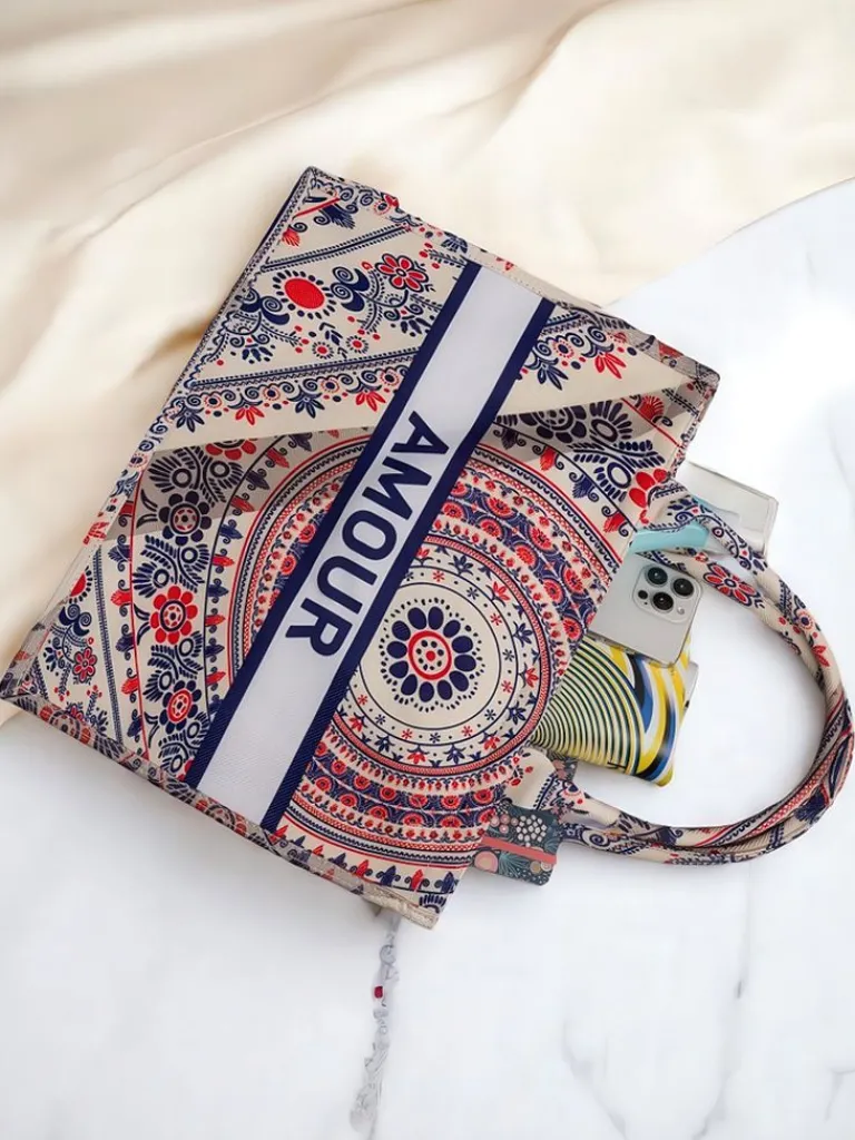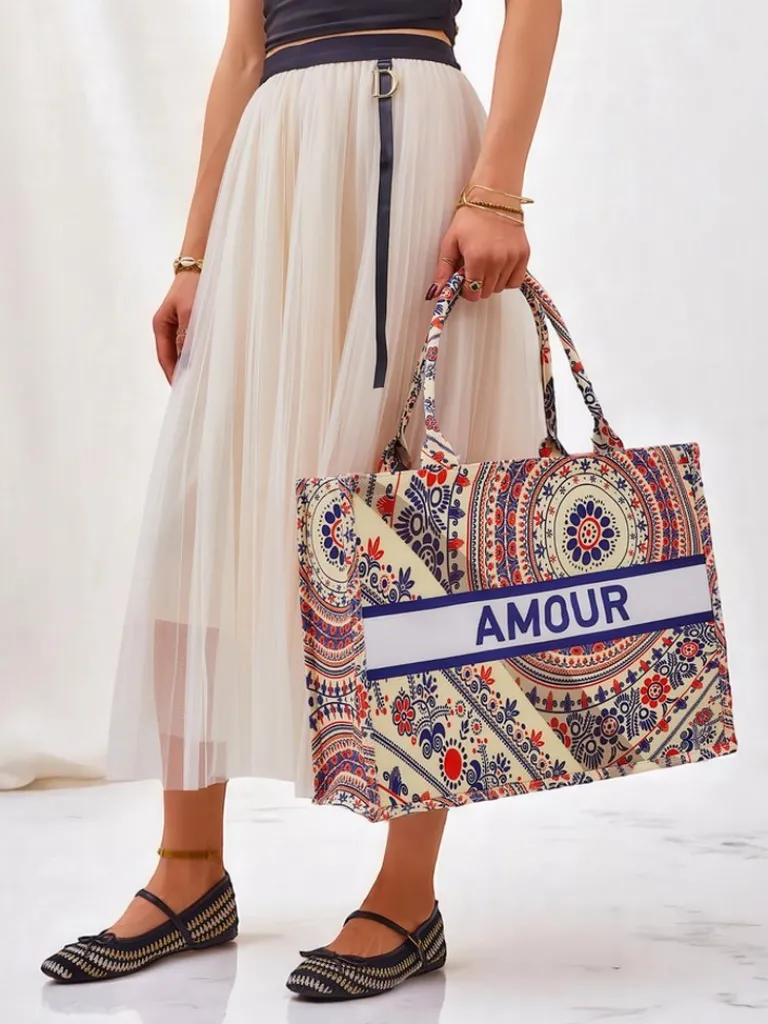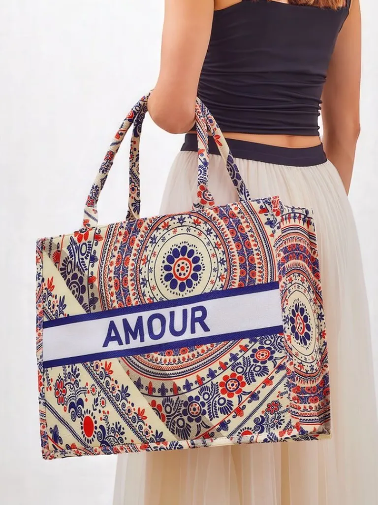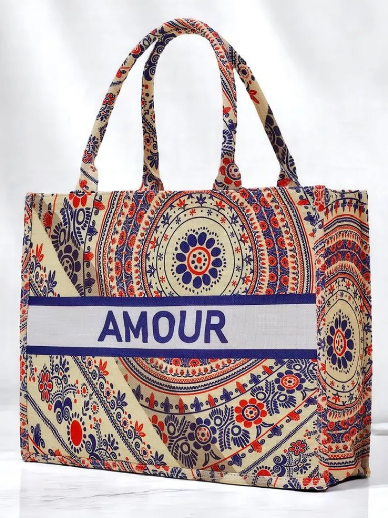 - Duża, materiałowa torebka damska z wzorzystym motywem i napisem AMOUR. 1 komora, zamek. Lekka, pojemna i stylowa – idealna na co dzień i letnie wyjścia!