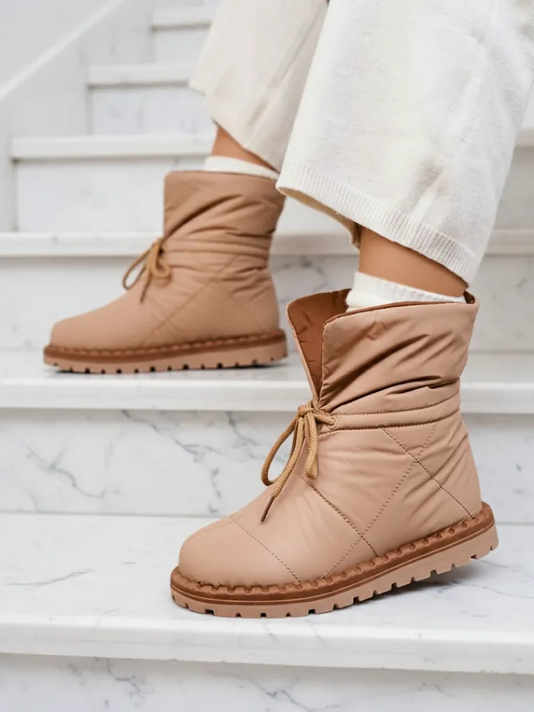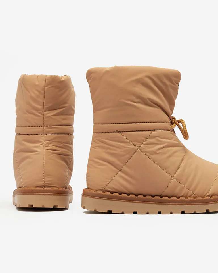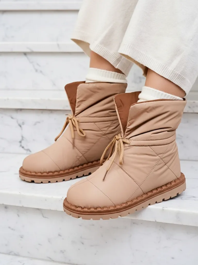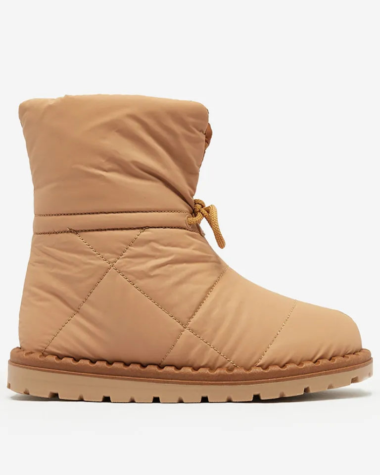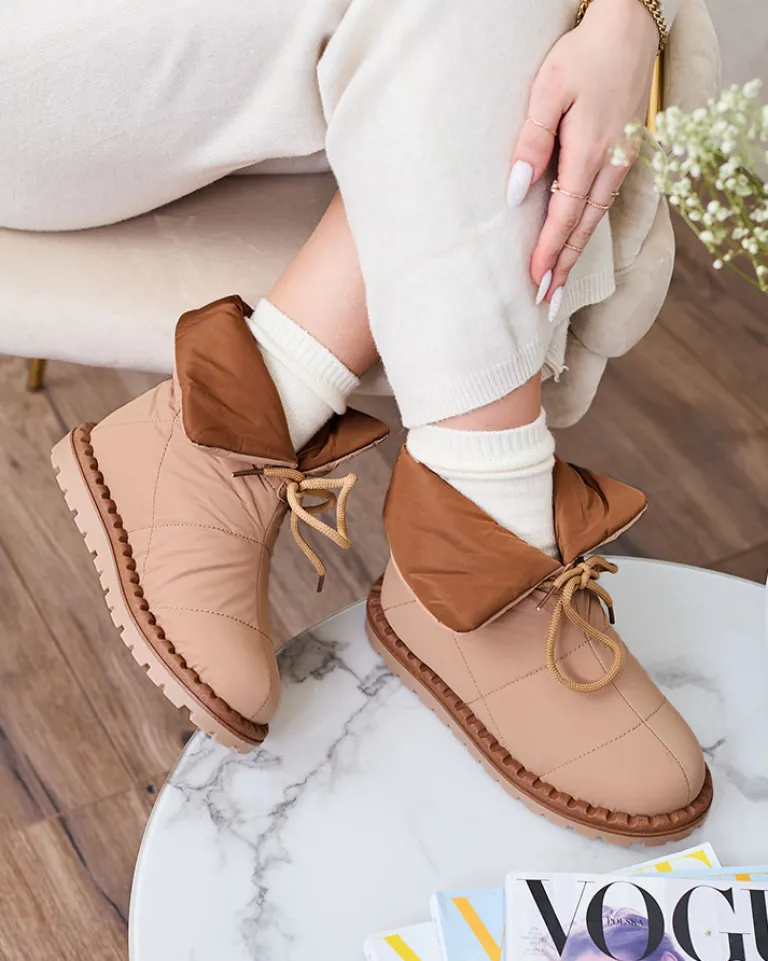- Damskie obuwie typu śniegowce z cholewką wykonaną z materiału a’la cerata. W środku ocieplenie w formie futerka, obuwie wsuwane i posiada ściągacz. Idealne na chłodniejszą porę roku!