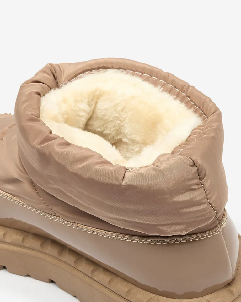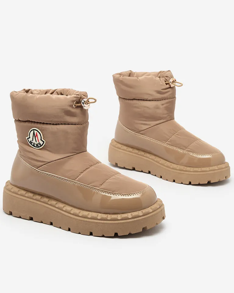 - Ponadczasowe damskie obuwie typu śniegowce z naszywką. Model cholewką wykonaną z materiału a’la cerata i wstawkami z lakierowanej eko-skóry. W środku ocieplenie w formie futerka, obuwie wsuwane i posiada ściągacz. Idealne na chłodniejszą porę roku!