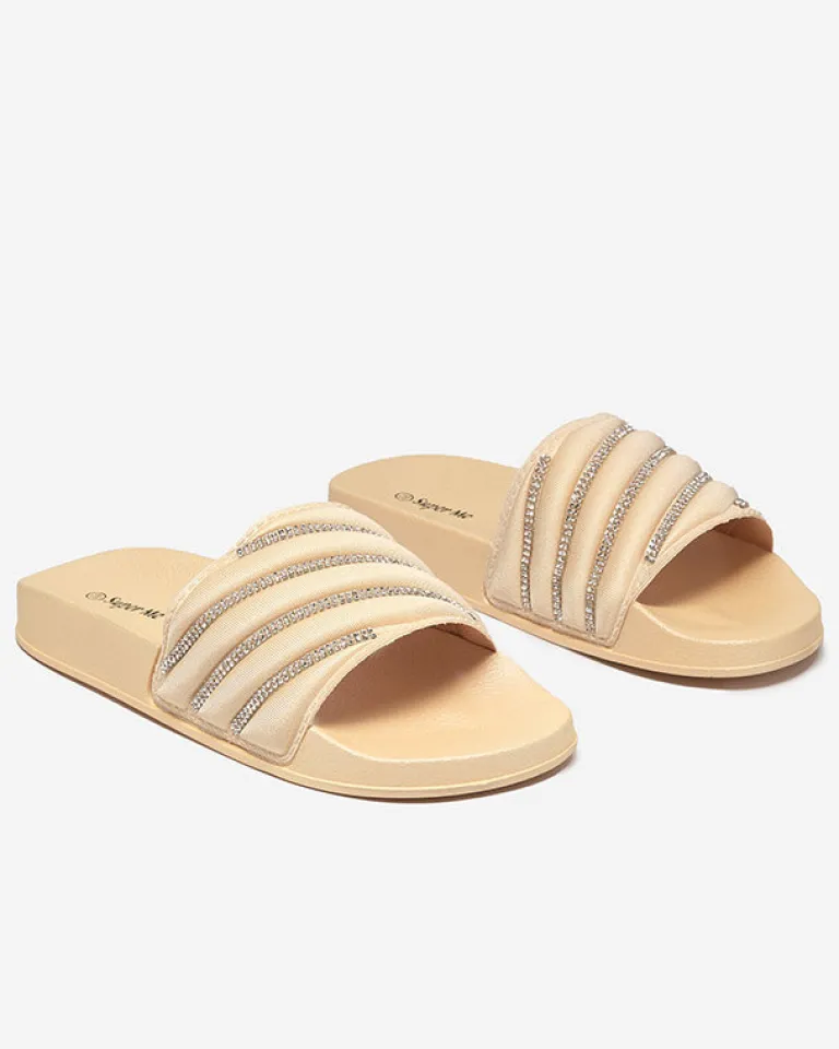 - Prześliczne damskie klapki na płaskiej podeszwie, zdobione drobnymi cyrkoniami, wkładka wykonana z tworzywa gumowego. Ta piękna para musi znaleźć się w Twojej walizce podczas urlopu!